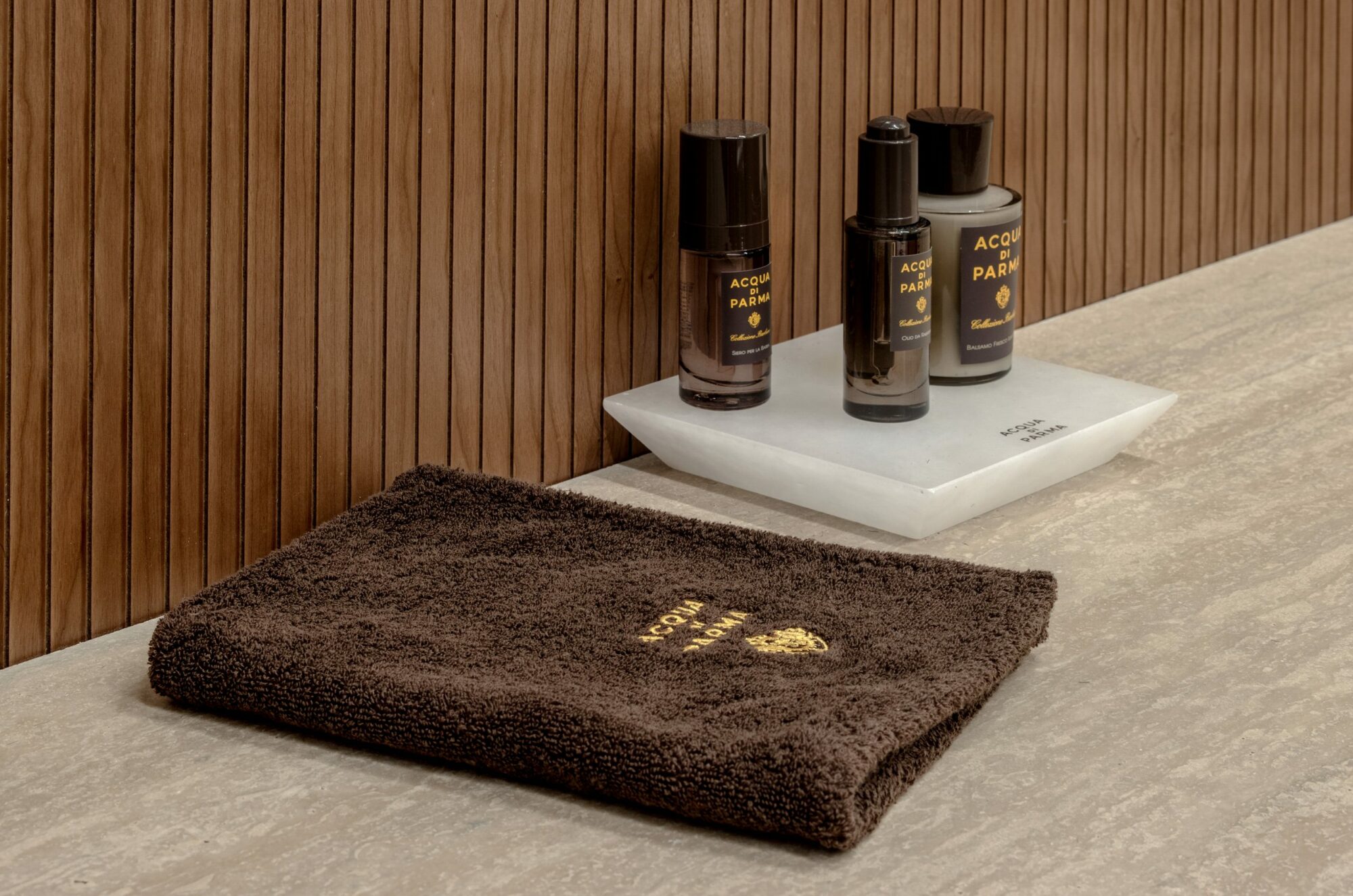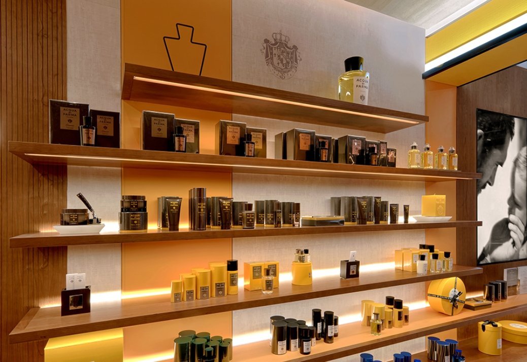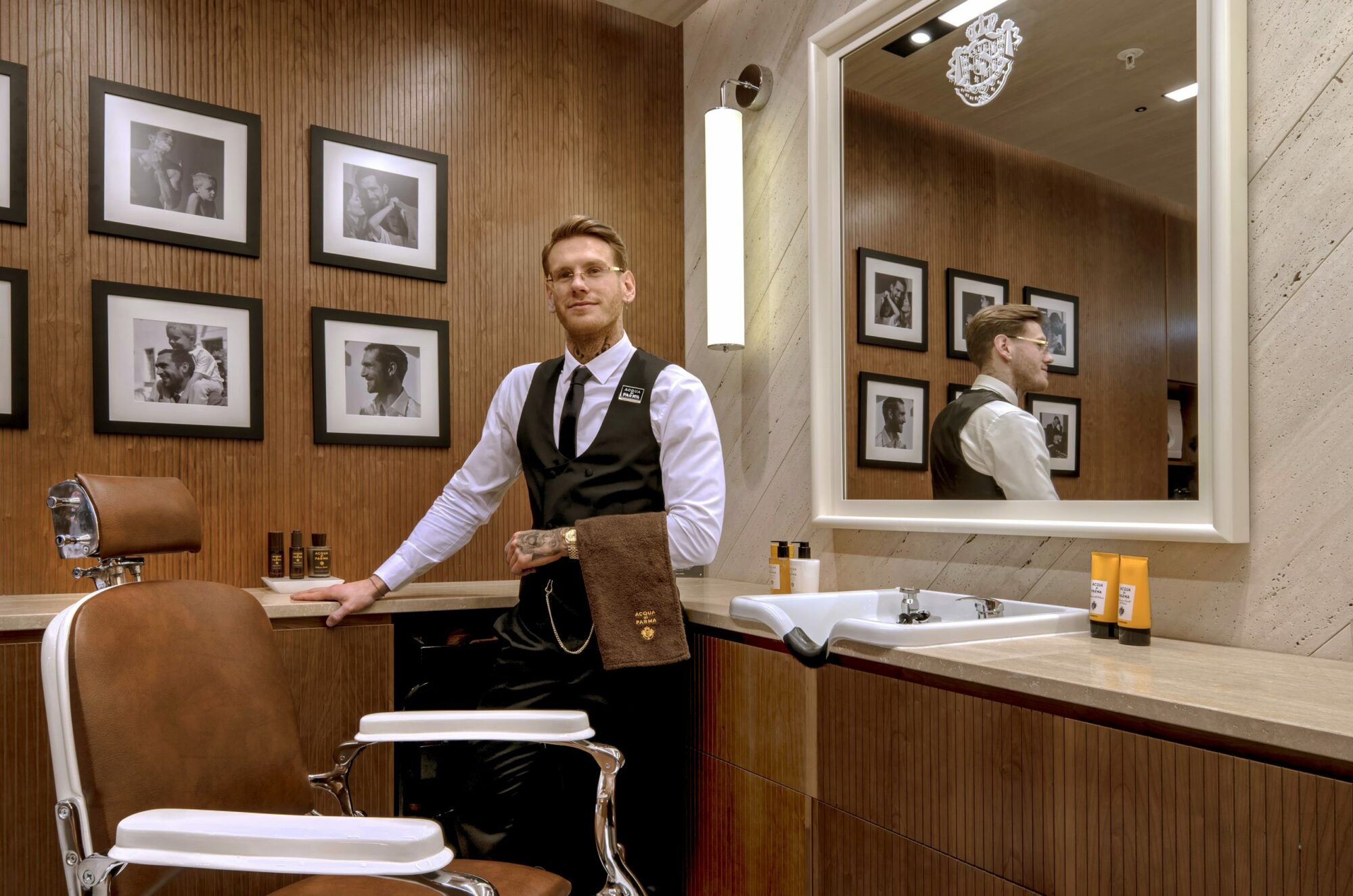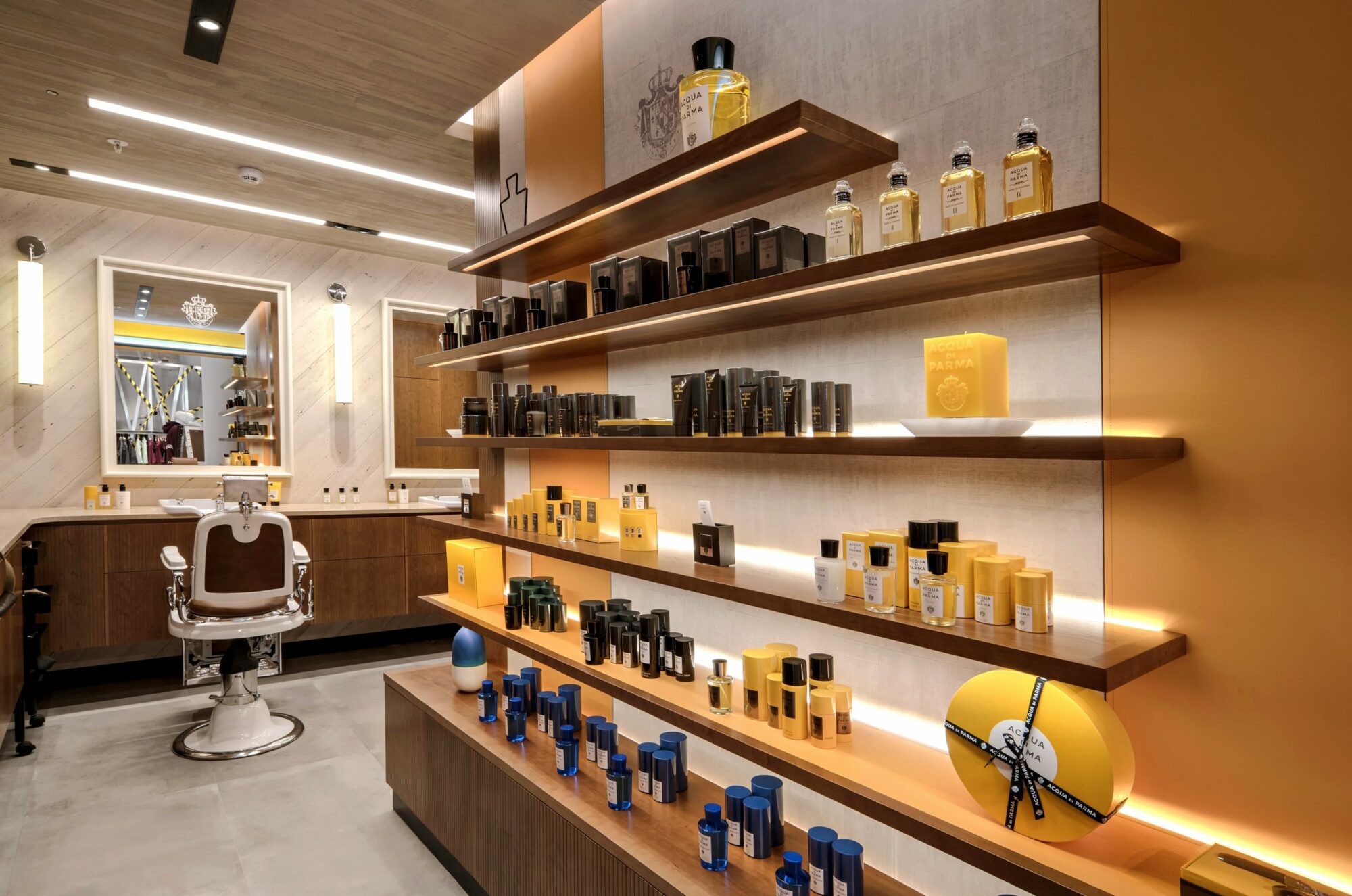 Smooth wooden furnishings, textured walls and warm lighting breathe a sense of calm and relaxation into the grooming experience. An ideal setting to become enveloped in Acqua di Parma’s sophisticated scents, fluffy foams and bristling brushes. The ultimate design transformation that ensures facial hair is always in fine fettle.