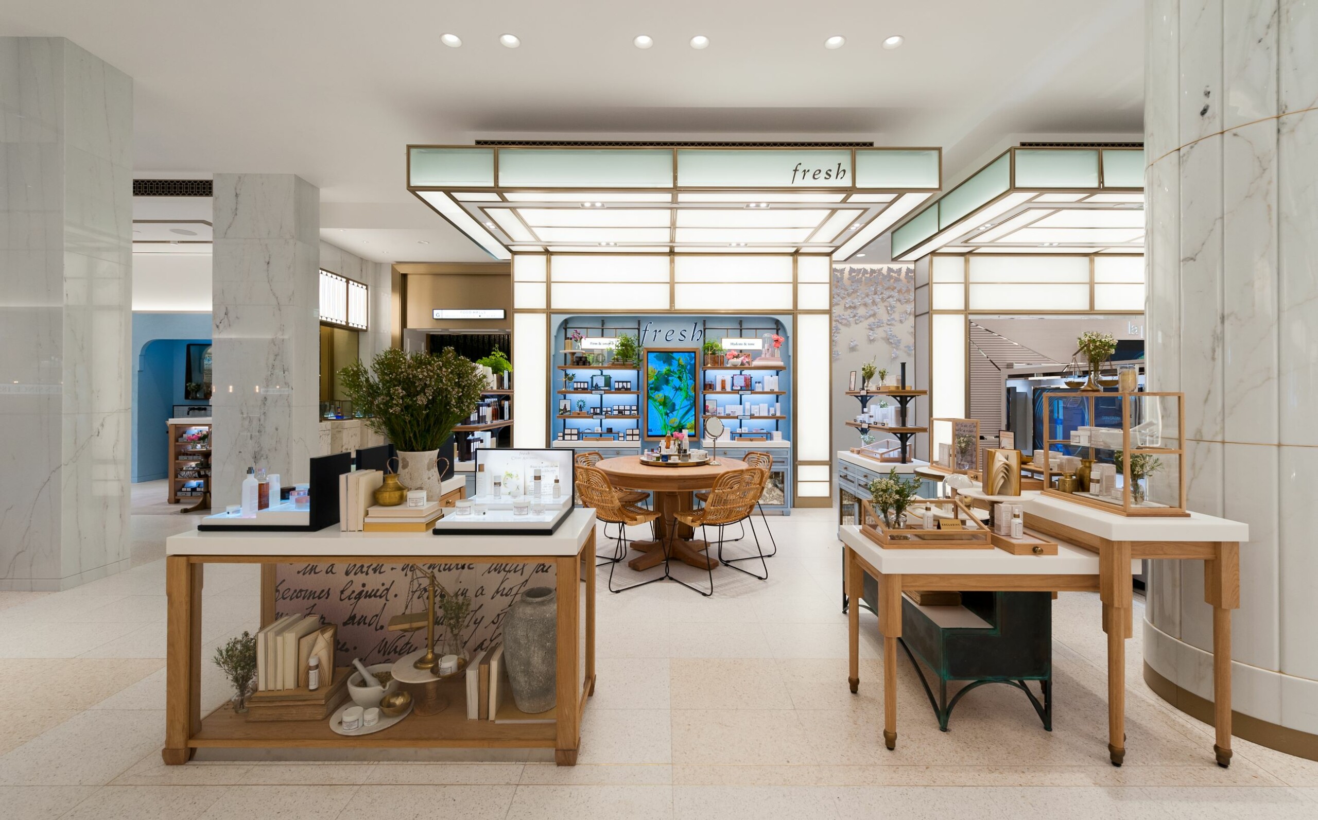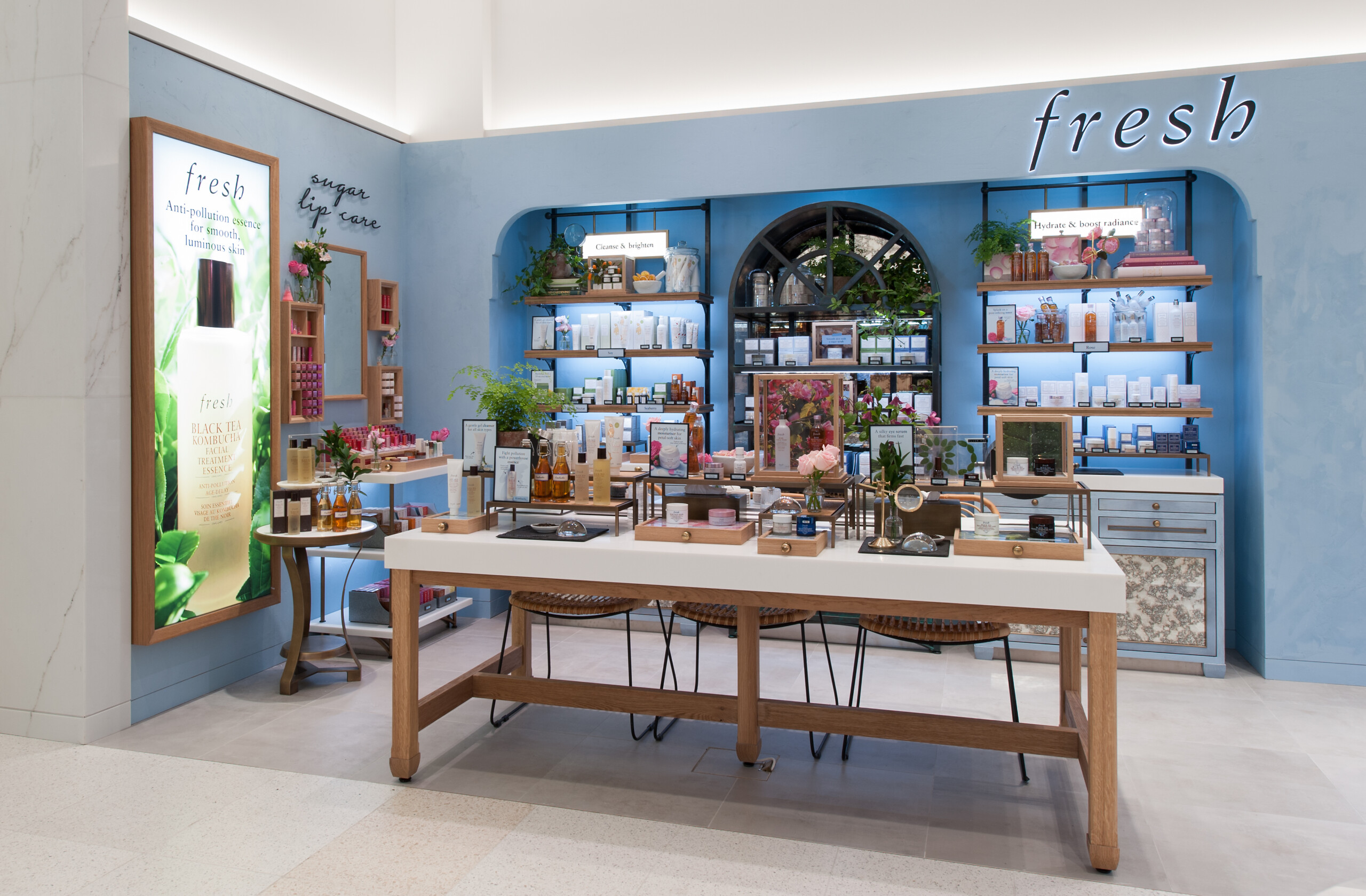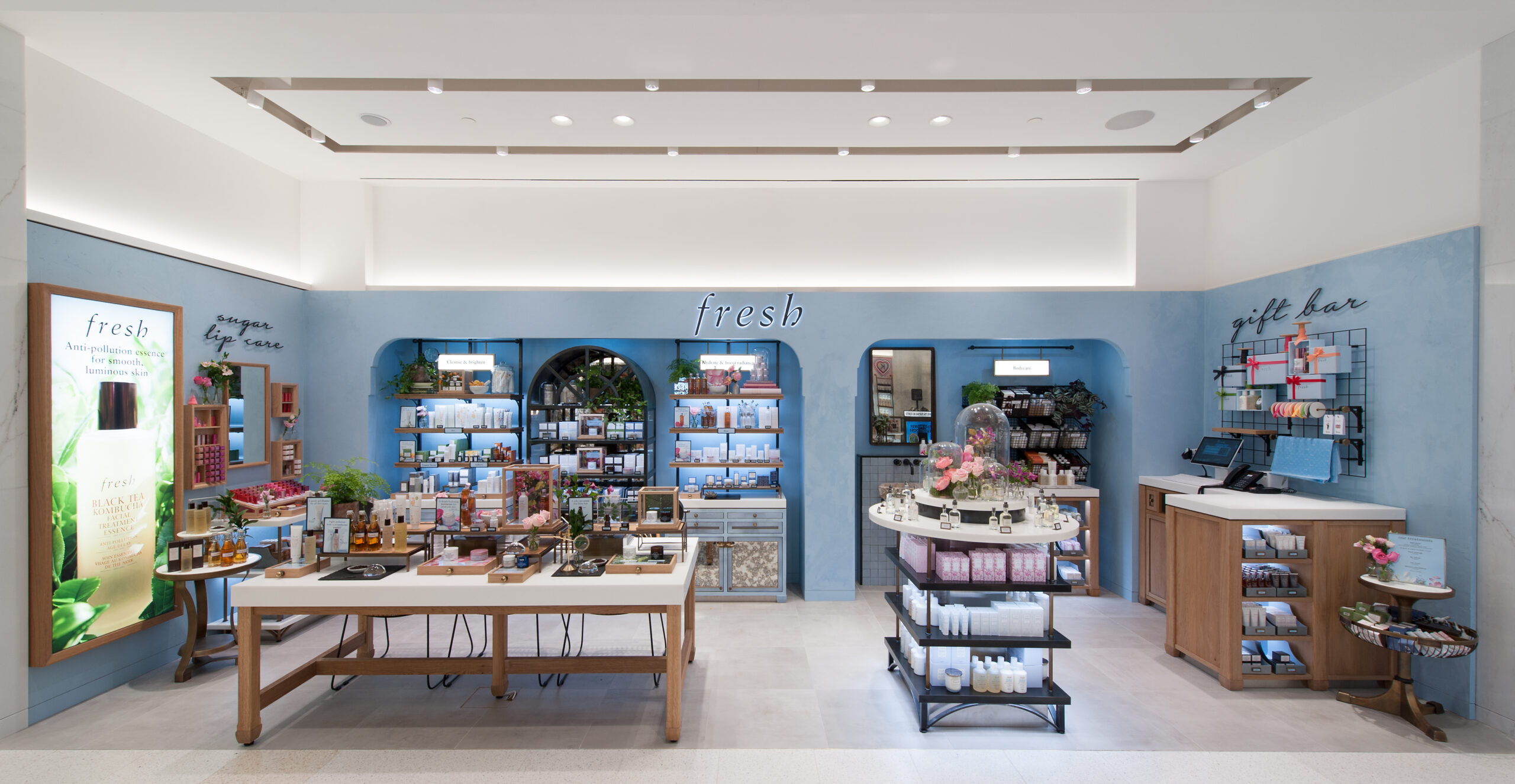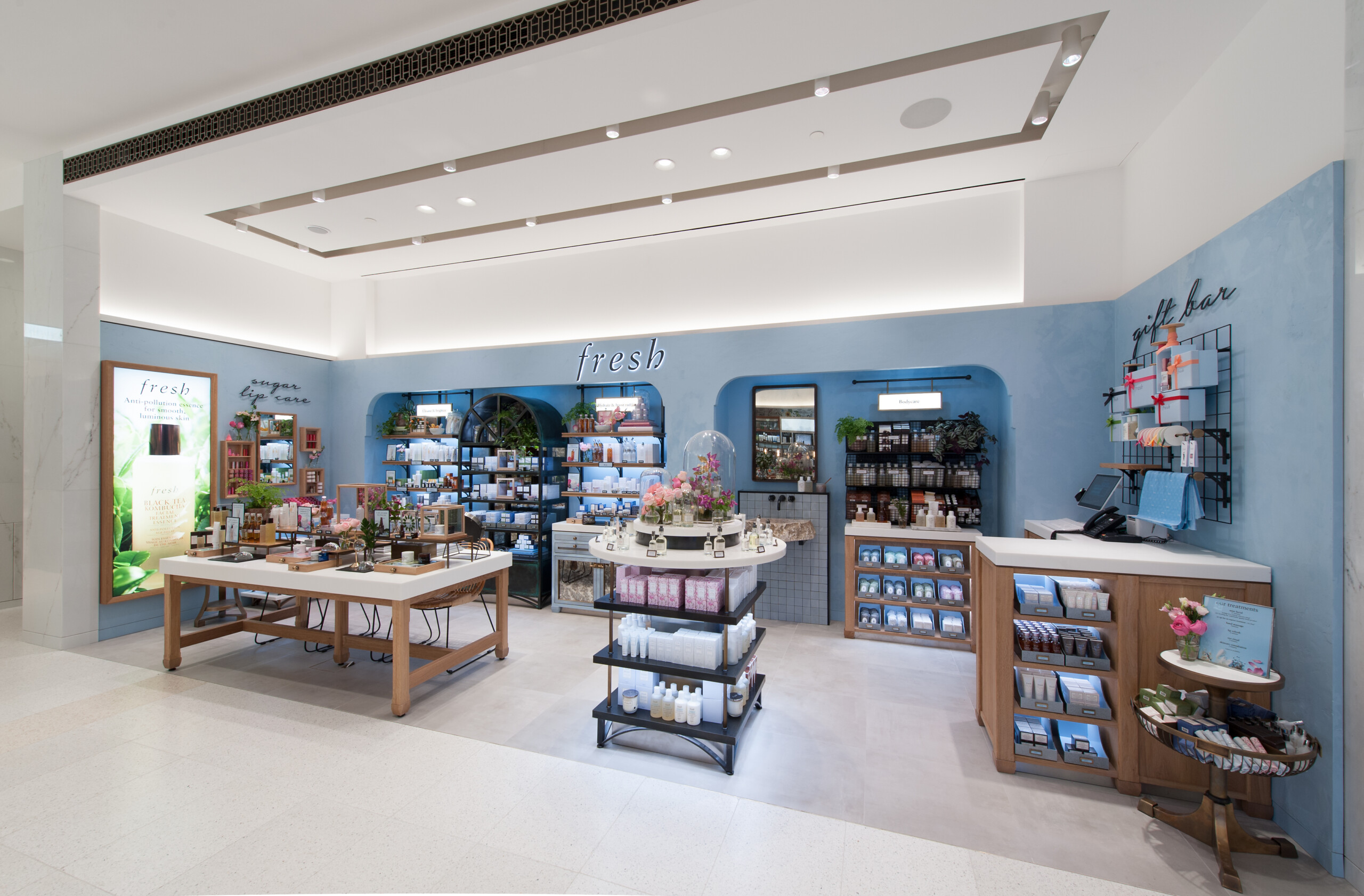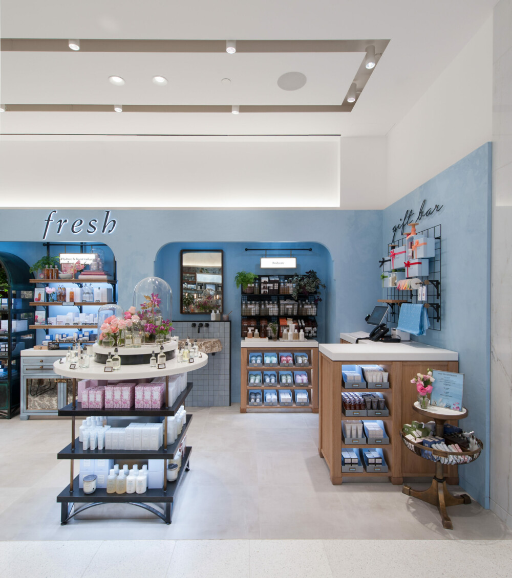 High-level visual merchandising and attention to detail create a language specific to Fresh, its followers and new customers; blues and botanics carefully connect the boutique brand space to a perimeter brand space, mid floor fixtures pique interest and immaculate, gold-trimmed furnishings deliver a sense of pared back luxury. Bright fixtures and an abundance of light create an open and unguarded atmosphere that aids spontaneous product exploration while a well-planned layout identifies important customer touchpoints. A unique design that reflects the brand’s original dream of making beauty that performs.