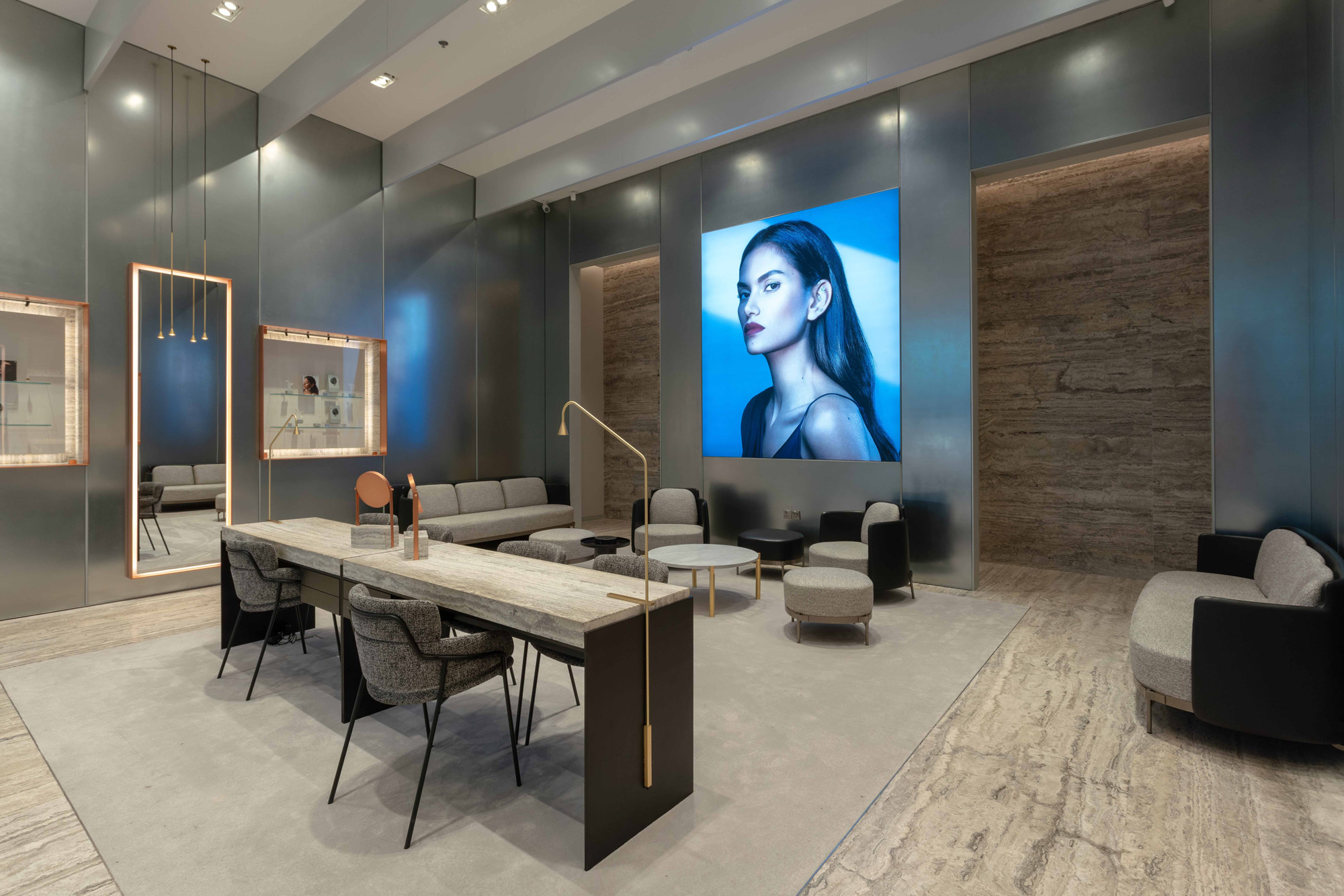 The principle that ear curation is an art form inspires the space’s contemporary, museum-like interior, featuring four custom treatment rooms and a VIP lounge. Cool grey furnishings, warmed by soft reflections, allow the jewelry collection to become a true focal point, while long, gold framed mirrors emanate statement luxury from the walls, creating a truly lavish experience. A resplendent space that is the perfect setting to welcome guests into the revolutionary world of Maria Tash.