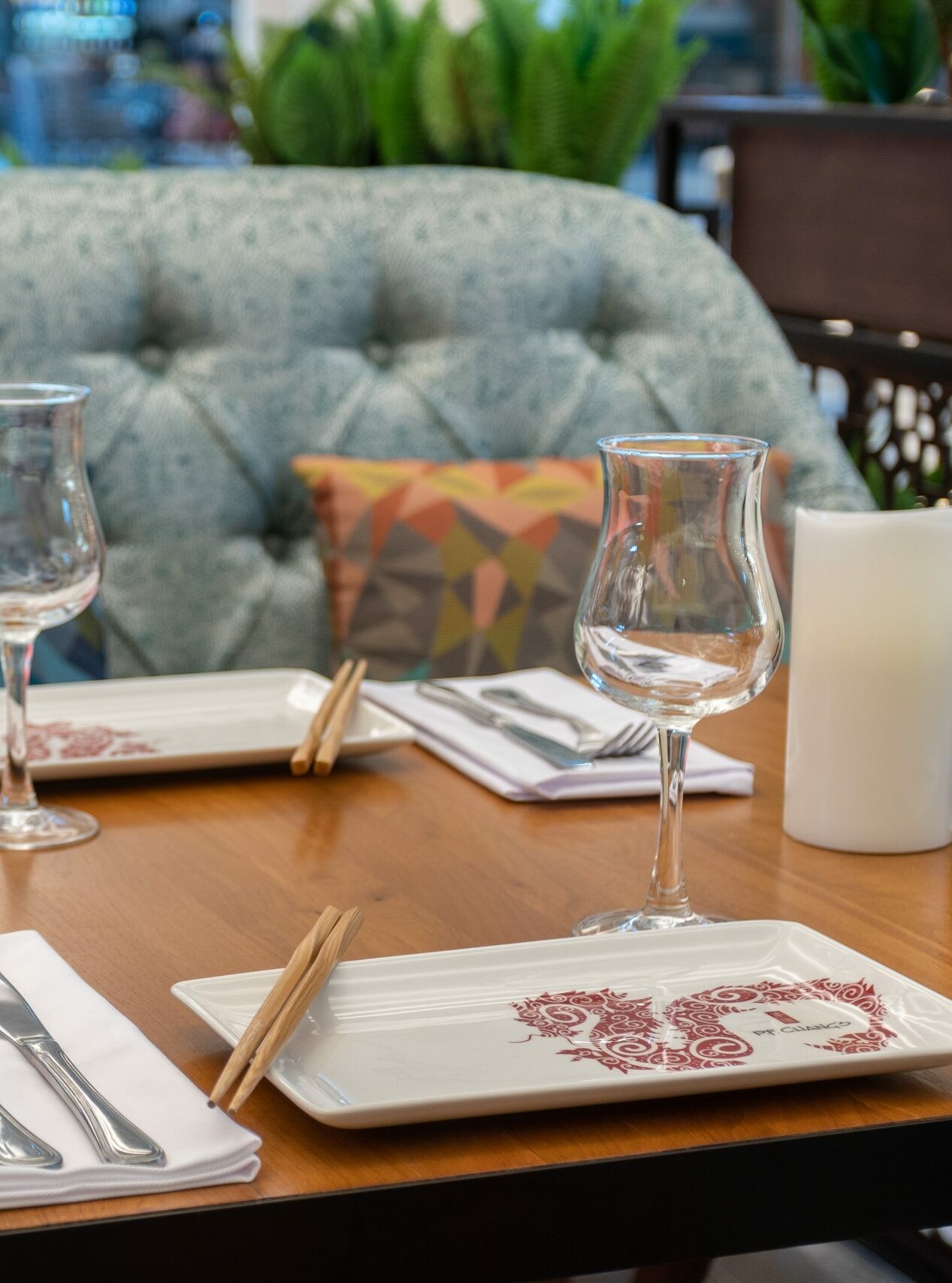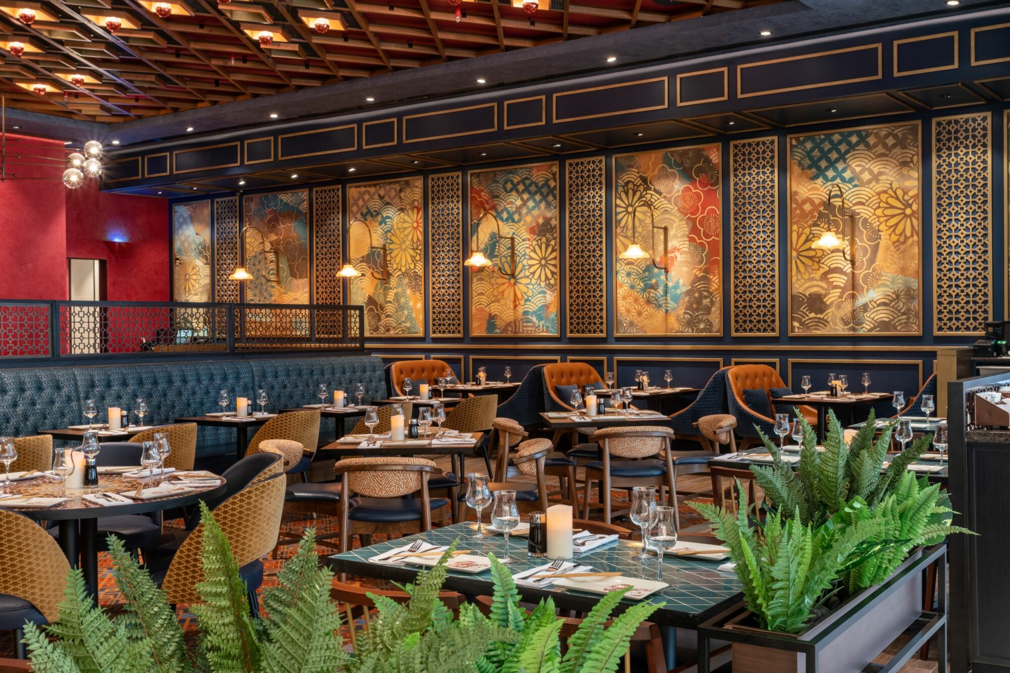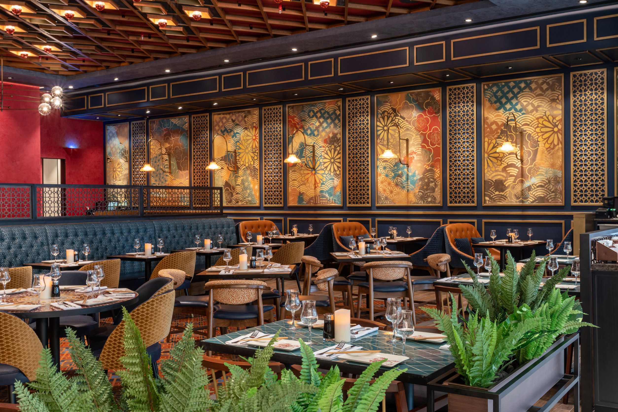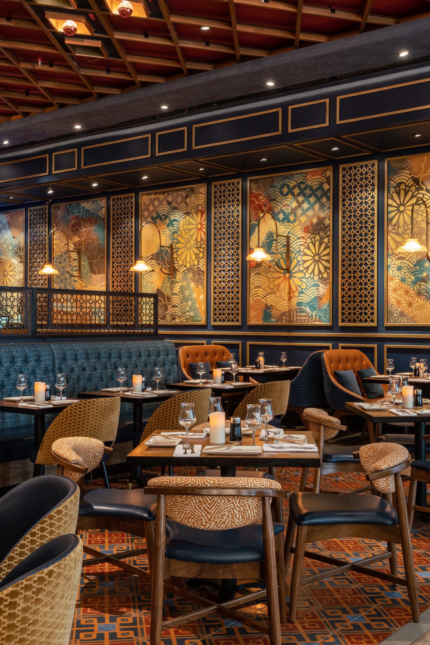 A full expression of indulgence from the inside out, dark hues, dimly lit spotlights and intricate geometric tiling create an immediate sense of warmth to tempt those peeking in. Inspired by the pictorial elements of ancient Chinese art, traditional shapes, motifs and illusions are brought to life; striking, hand-painted murals and ornate gold panelling provide texture to table talking points while colorful, symmetrical patterns emanate from floor to ceiling, creating an atmosphere of curiosity and imagination – the perfect setting to jump into the vibrant flavors of t’sai and fan.