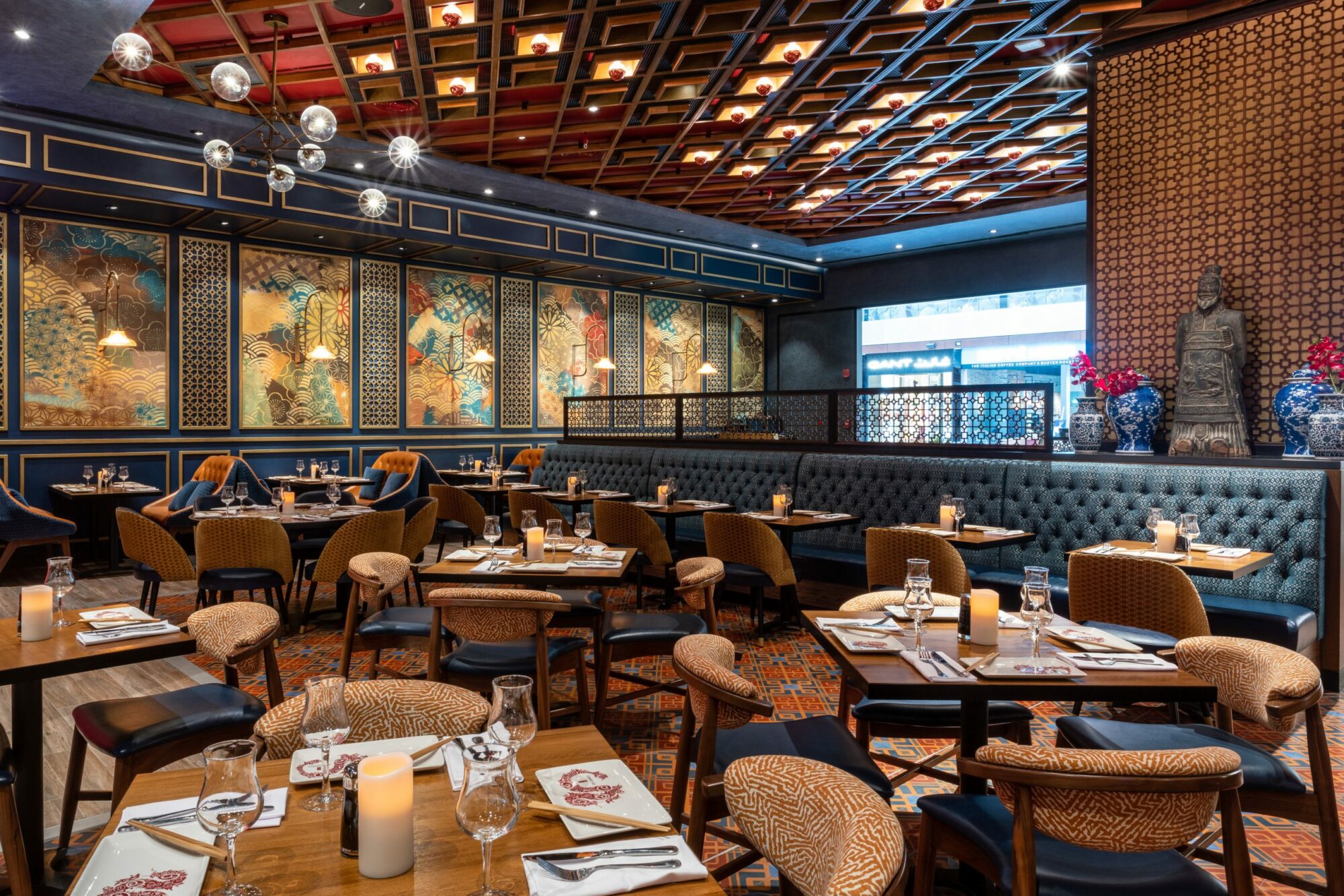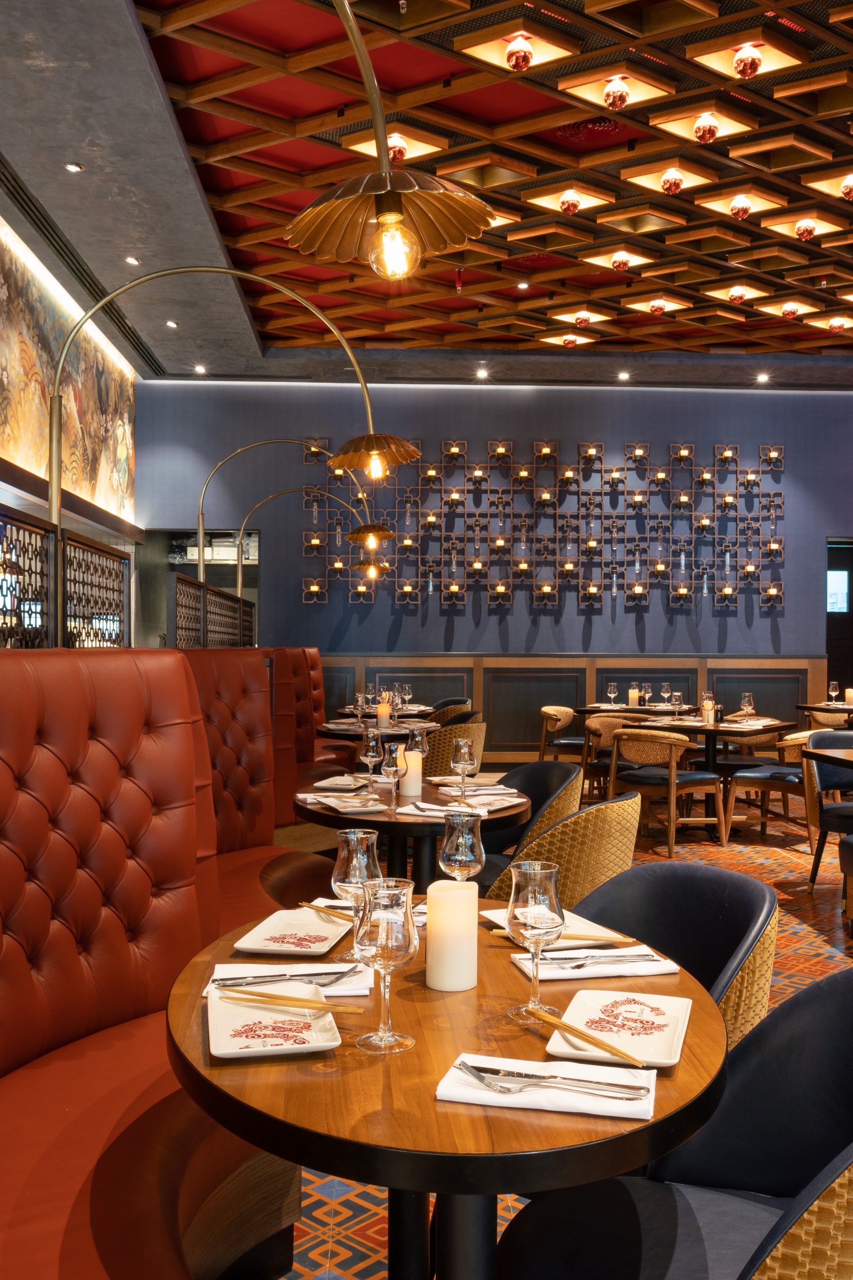 In contrast, contemporary ruby-red leather banquettes, brass fixtures and exposed lighting feel modern, plush and inviting, working in agreement with the traditional Chinese design to create a culturally immersive customer experience.