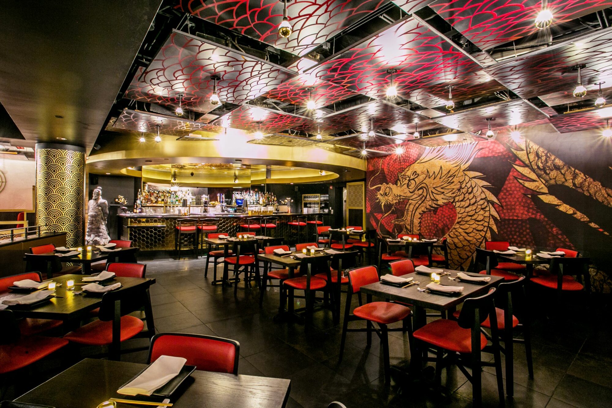 A hand painted mural of the iconic P.F. Chang’s warrior stands to attention at the staircase, inviting guests to experience the flavors of the east seated within the restaurant or on-the-go. Life-size warrior statues transport guests into a mythological world, where a Dragon’s Nest bar adorned with brilliant, geometric gold tiling that emulate dragon scales is closely guarded by a stern wall-to-floor painted dragon. The dragon’s movement is represented throughout the space by illuminated gold custom light fixtures that create a soft, atmospheric glow.