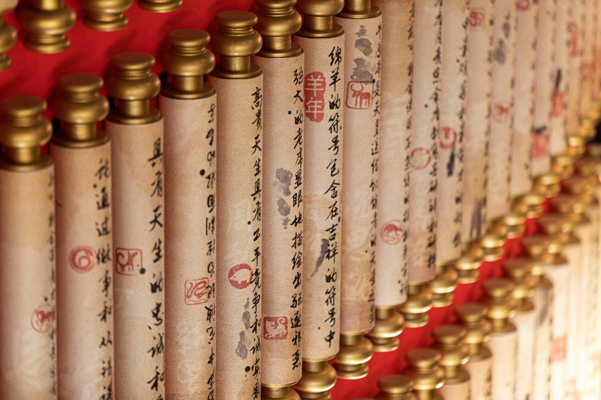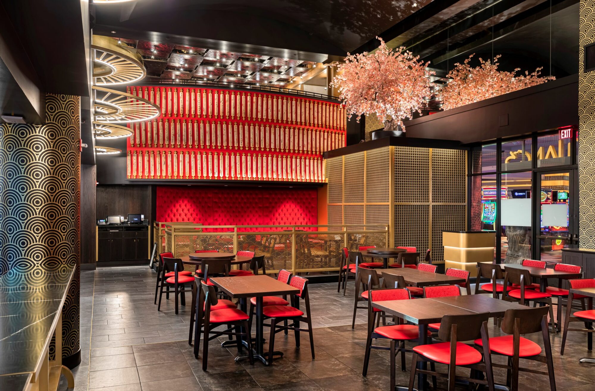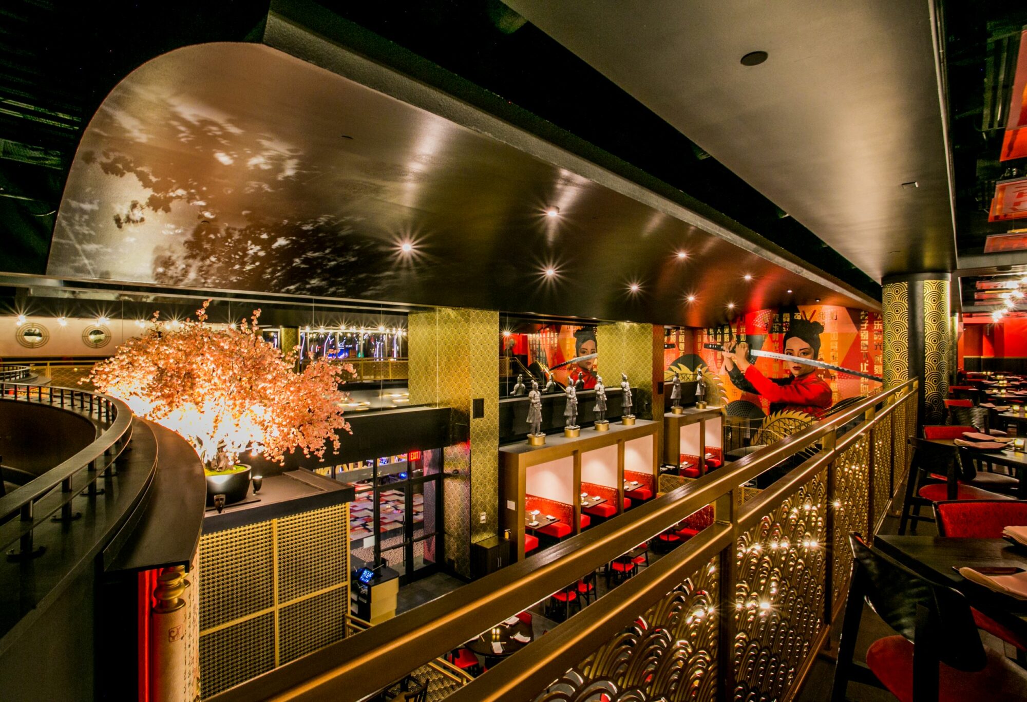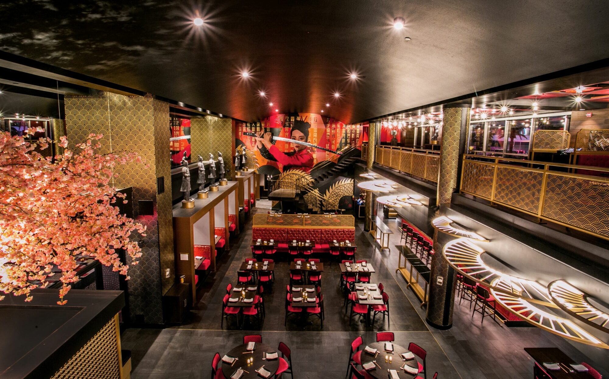 Perched on the second floor is a dynamic dining area where a bright pink cherry blossom tree cascades onto the first floor, connecting both areas and providing an eye-catching contrast to the luxurious red, black and gold color scheme.