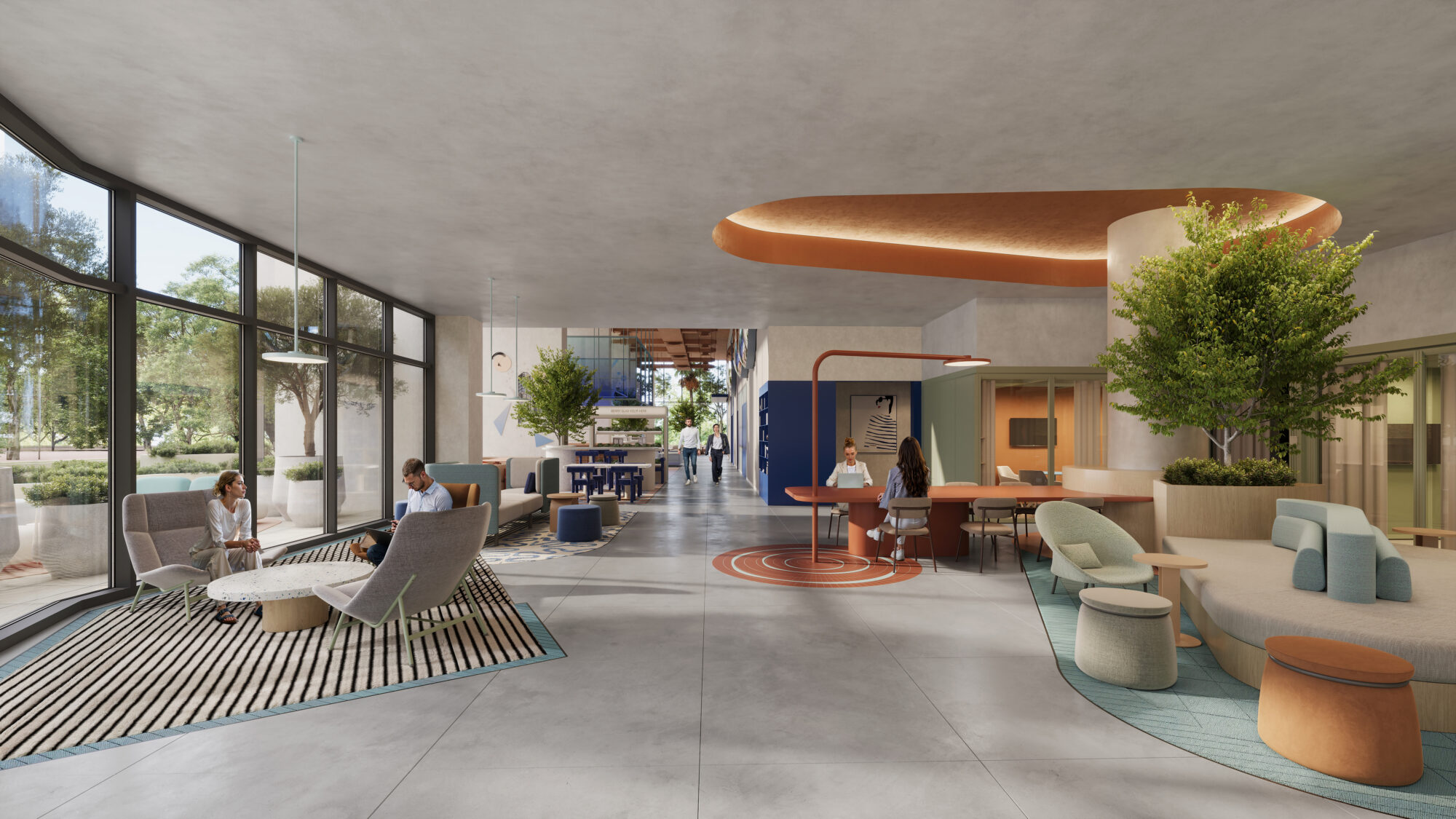 At the ground level, a double-height entrance with an organic café, seating lounges, coworking areas and retail spaces welcomes, a vertical library captivates, reading nooks immerse and an indoor vertical garden adorned with playful artwork and lightbox quotes, inspires – inviting both pause and discovery.