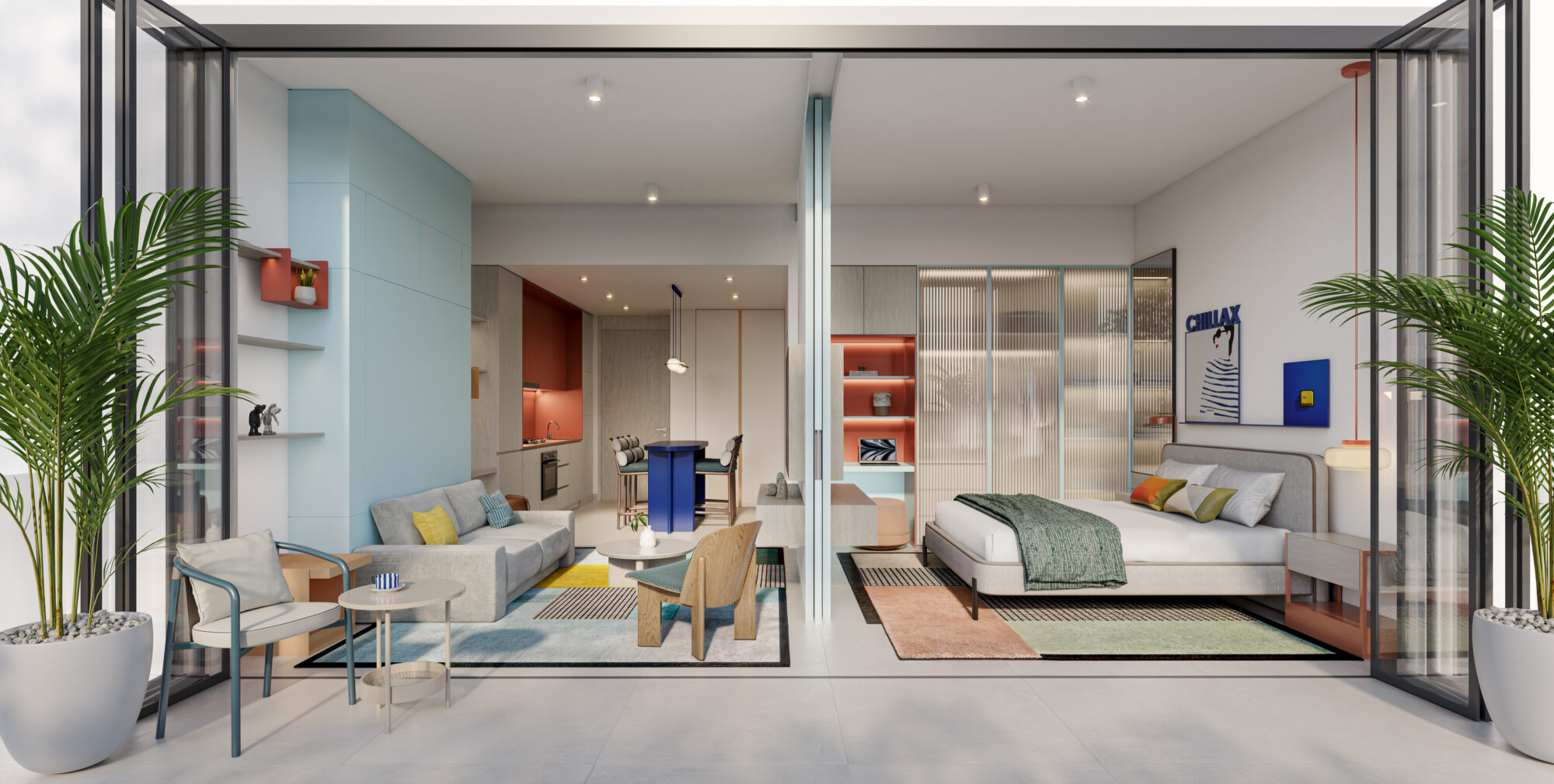 Living spaces are designed to maximize function and flexibility including tatami-inspired modular furniture with built-in storage that could be used both indoor and outdoor, connecting the apartment and balcony as a large living zone. Full-height panels allow spaces to transform between sleep, lounge and work zones, while a light, airy palette with playful color pops keeps the spaces bright and energetic.