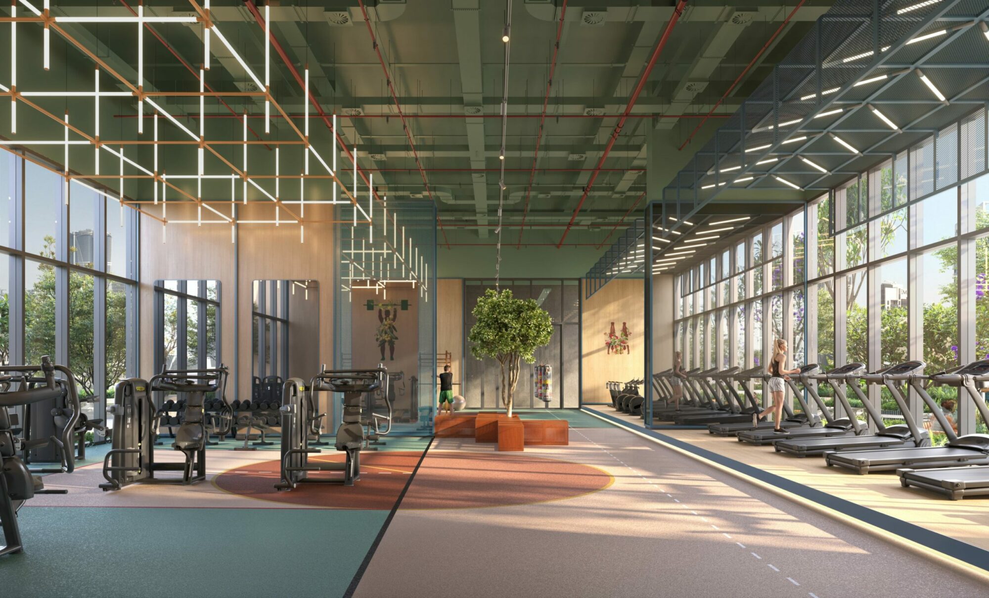 At the podium level, a massive sculptural staircase uniquely creates a direct connection to the nearby park. Designed with bi-fold façade, the gym, multifunction and events lounges are designed to flexibly open up to the outdoor landscaping, blending indoor and outdoor. Metal ceiling features subtly define activity zones across seamlessly flowing multifunctional zones, punctuated by a monkey bars feature.