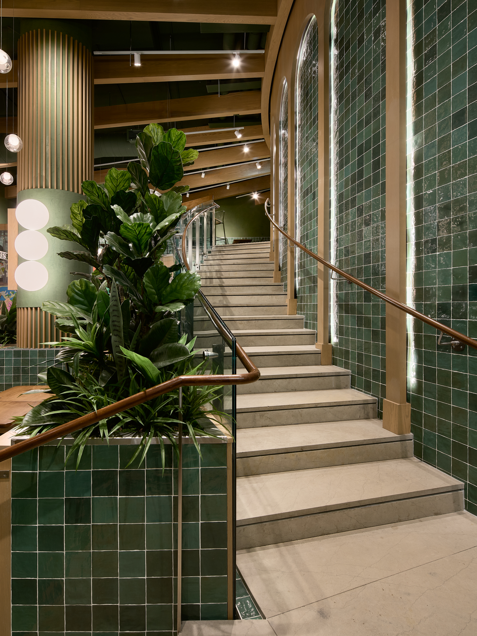 The new shack sits within the 13-story complex, spanning over 6,700 square feet of space and over two floors. As part of the brief the client wanted to combine the traditions of the local area, with a modern, fresh aesthetic. Zebra decided to explore this scheme concept by referencing the elegance of a bygone, theatrical era and blend it with a modern culinary feel. Designed by Zebra, the shack celebrates the rich theatrical history of the area, drawing inspiration from legendary local venues such as the Ed Mirvish Theatre, Coronet Theatre, Elgin and Winter Garden Theatres. The new Shake Shack captures the timeless allure, providing guests with a unique dining experience that honours the rich cultural and architectural heritage of the neighbourhood.