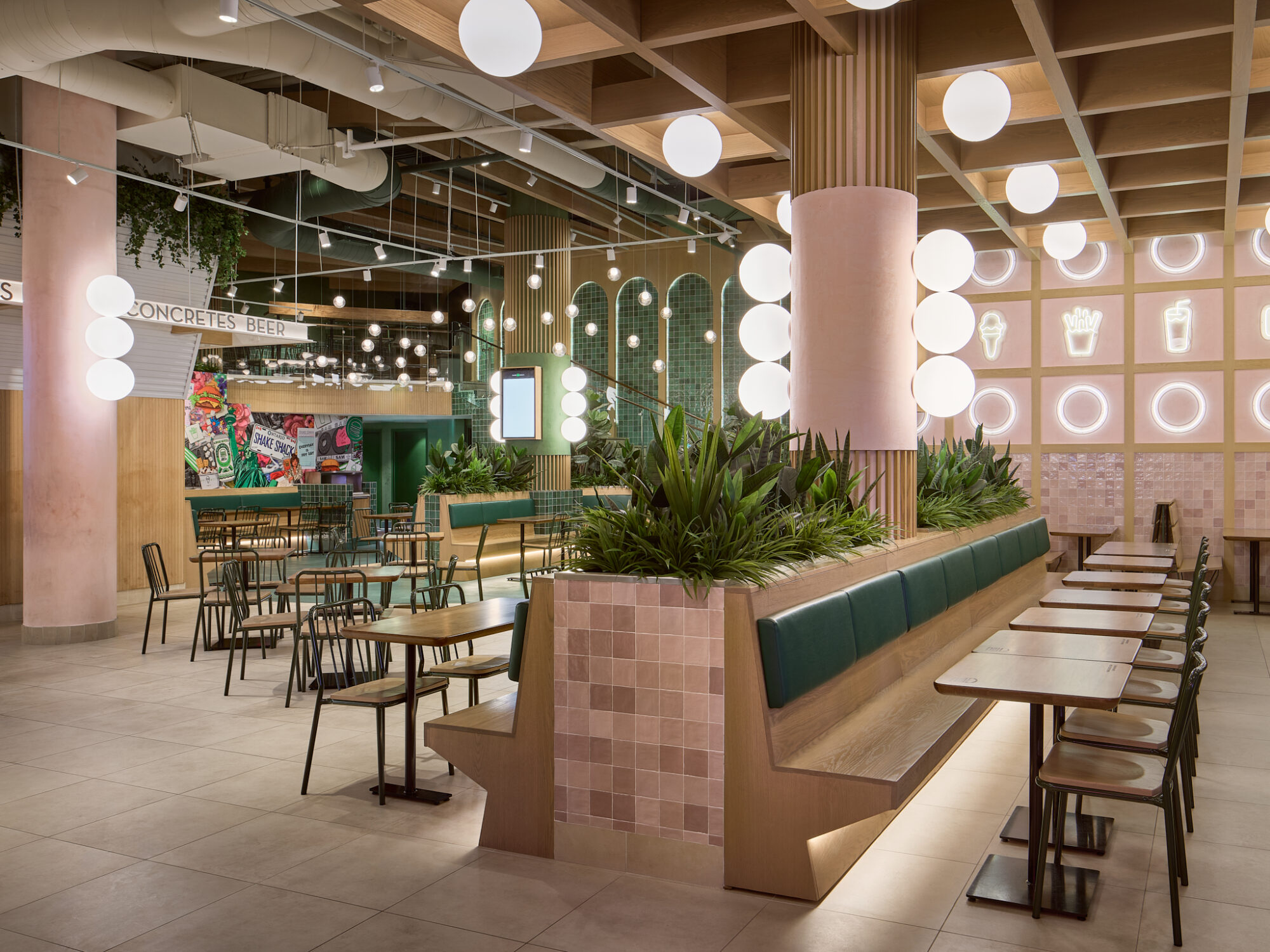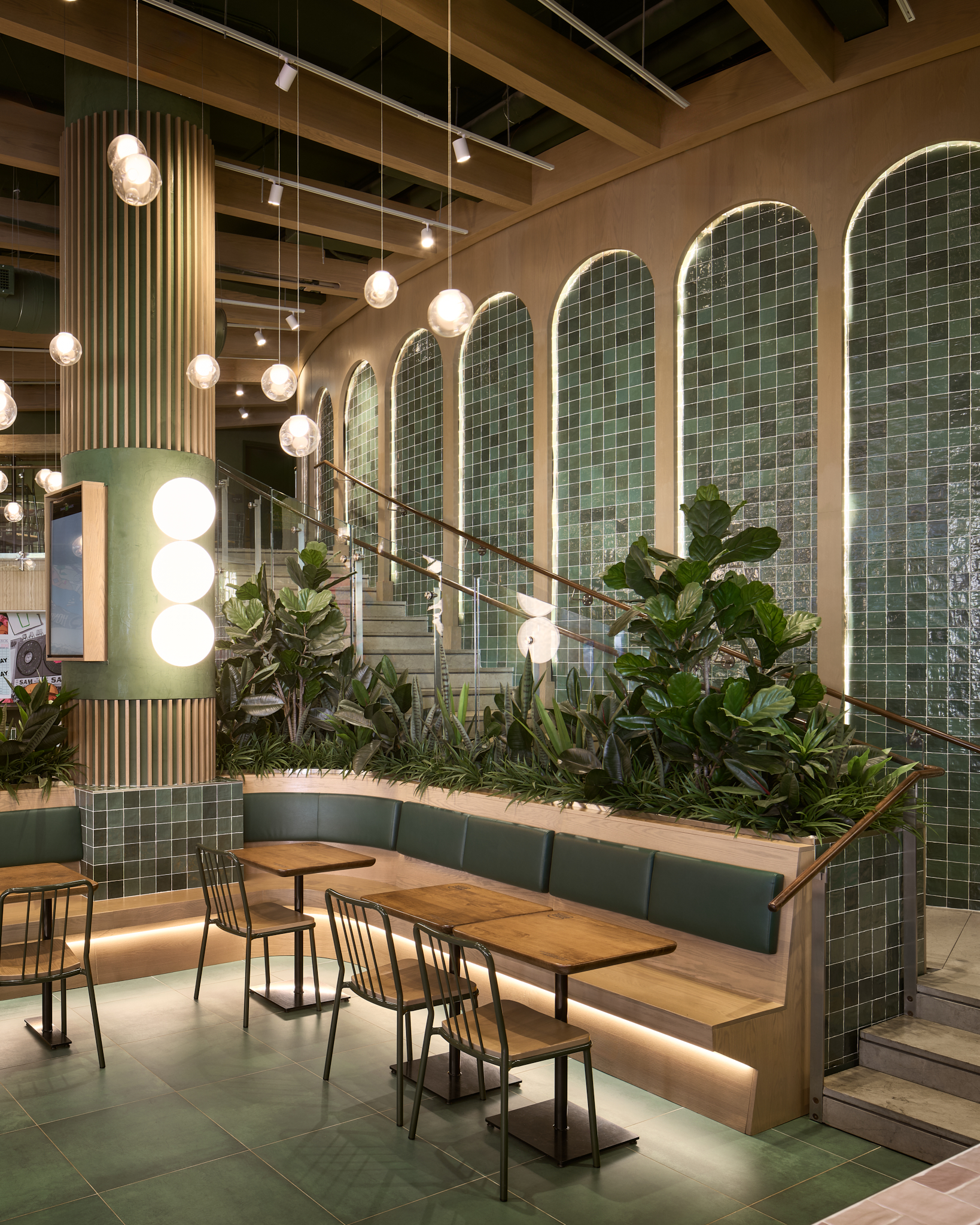 The design features an opulent fusion of heritage and modernity, with brass accents, vintage-inspired details, and a rich colour palette that evokes the ambiance of classic theatres. The décor includes dramatic light bulb signage and sconces that cast a warm, inviting glow, ensuring customers enjoy an inviting atmosphere.
