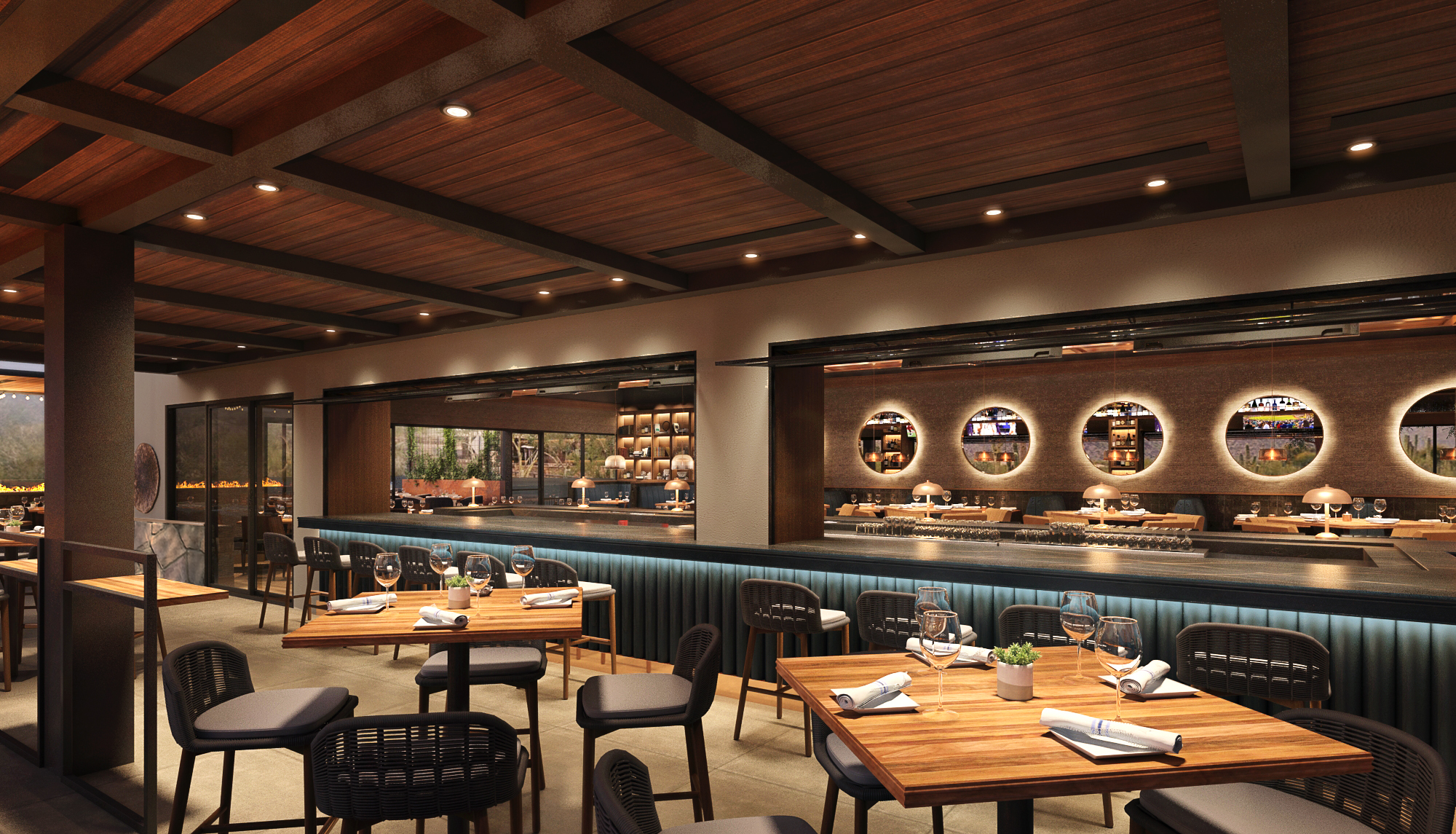 Complimentary to the breath-taking views, soft lighting, wooden paneling and a cool color palette create a warm, family-friendly environment. A wood fired rotisserie adds an additional feeling of comfort to the space, providing the perfect setting for relaxed, yet magnificent, dining.