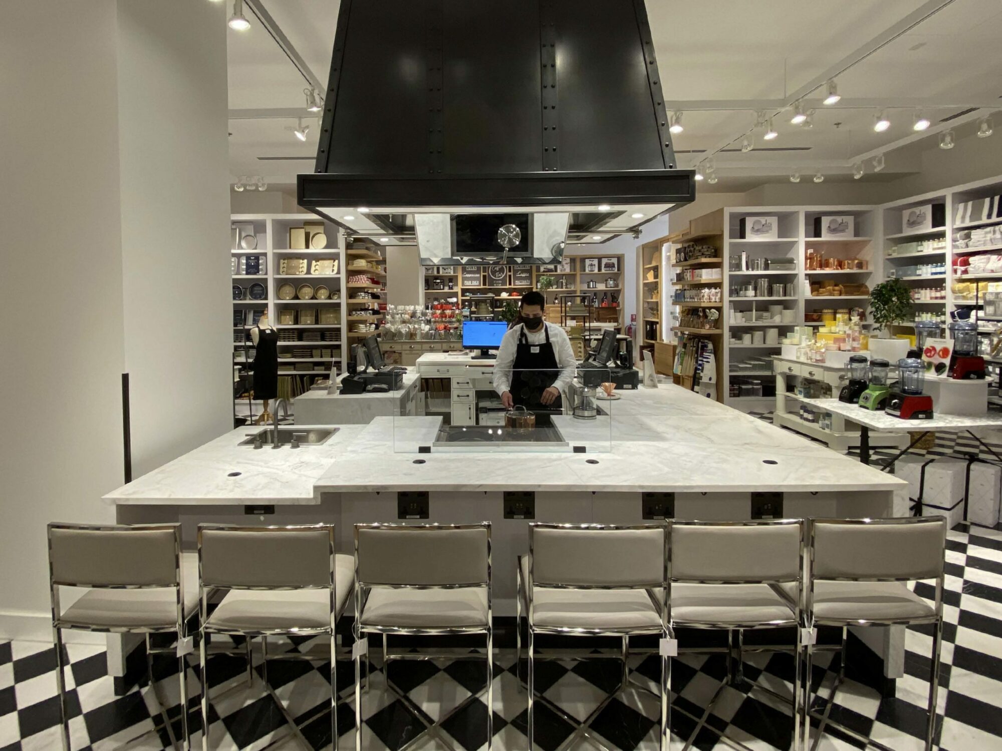 Inviting consumers to feel part of the Williams Sonoma world is key; products curated by area are displayed in lifestyle scenarios that bring the store to life, inspiring consumers to recreate the brand’s timeless luxury at home. Crisp white walls, polished plaster architecture, accompanied by rustic wood shelving and contemporary black accents provide a minimalist backdrop to the space, placing the brand’s distinct light fixtures, luxury home furnishings and culinary collections in the spotlight.